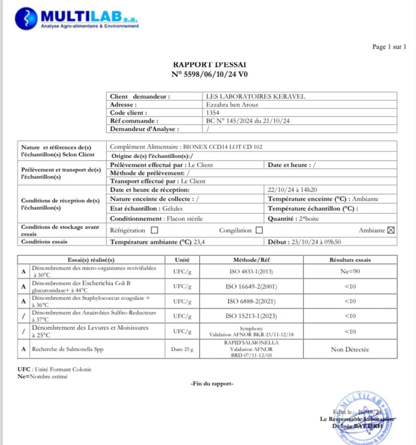 يتم تصنيع CCD14 في مختبرات Laboratoires Keravel التونسيّة . نحن نفخر بكوننا الشركاء الرسميين لهذا المختبر الرائد في تصنيع المكملات الغذائية عالية الجودة.